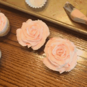 Delicious cupcakes decorated with beautiful pink rose frosting, arranged on a wooden table.