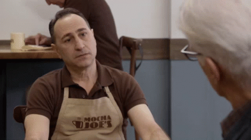 Saveiro Guerra from Curb Your Enthusiasm, wearing a Mocha Joe's apron, looking suspicious.