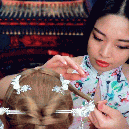 Tingting ASMR performs intricate Royal Chinese hairstyling, adding elegant hair decorations.