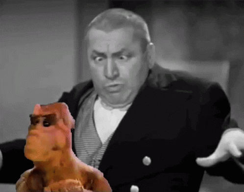Curly of the Three Stooges reacts with a surprised expression to Alf, the alien puppet.