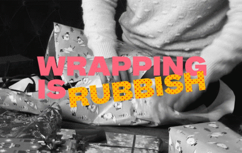 Hands wrapping a gift with the message 'Wrapping is Rubbish', promoting eco-friendly gift solutions.