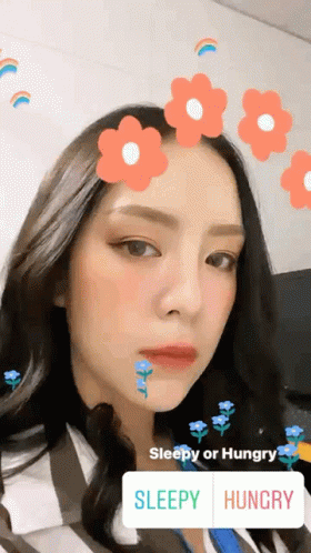 เมย์โกะ (Mayko) poses with a cute flower filter, featuring an interactive 'Sleepy or Hungry' poll.