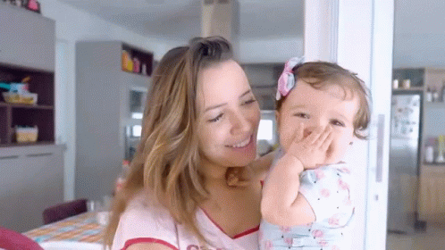 Taciele Alcolea holding a cute baby girl who covers her mouth playfully.