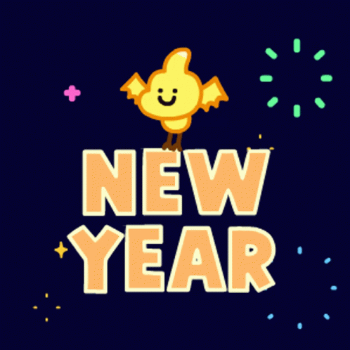 An adorable animated yellow bird perches on 'NEW YEAR' text, surrounded by festive sparkles and fireworks.