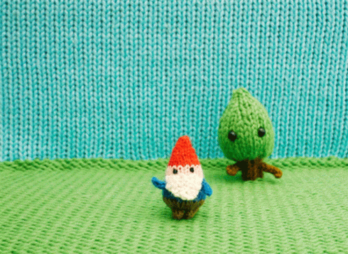 A cute knitted gnome stands next to a knitted tree, with a light blue and green background.