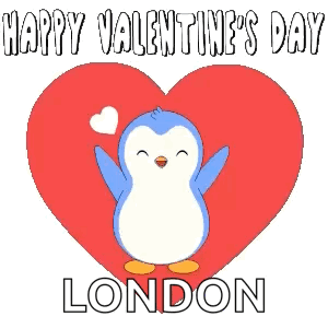 A cute blue kawaii penguin stands in front of a red heart, wishing "Happy Valentine's Day London."