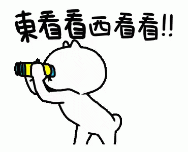 A cute kawaii cartoon cat, looking alert, peers through a pair of blue binoculars.