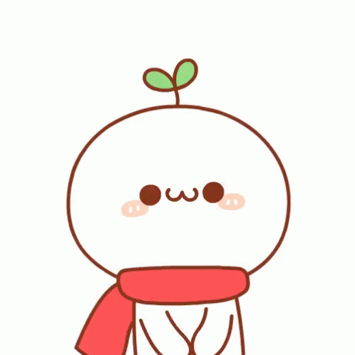A cute cartoon character with a sprout on its head, wearing a red scarf and holding a pink heart.