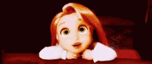 Cute Rapunzel from Tangled with wide eyes, resting her head on her hands at a table.