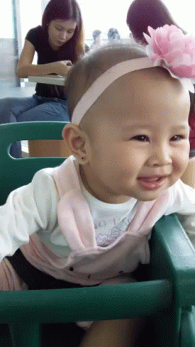 An adorable baby girl with a pink flower headband smiles, laughs, and makes cute expressions while sitting in a high chair.