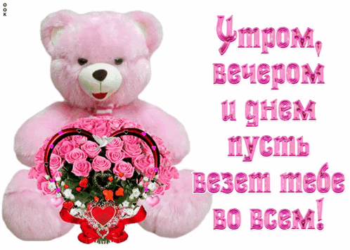 A pink teddy bear holds a heart-shaped bouquet of roses, accompanied by a Russian wish for good luck.