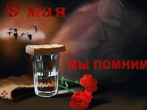 A glass of water with bread, red carnations, and the text 'May 9, We Remember', commemorating Victory Day.