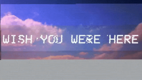 A glitchy cyberpunk sign displays 'Wish you were here' against a cloudy sky.