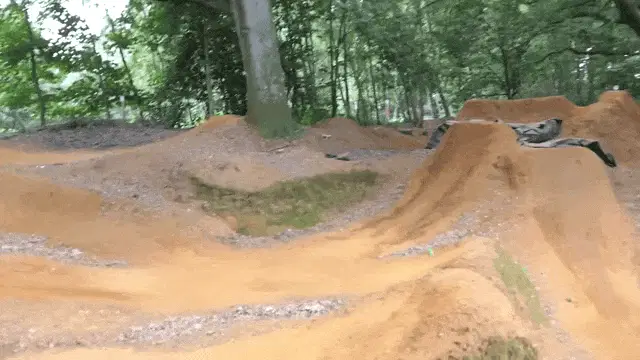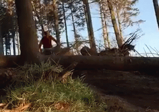 A mountain biker skillfully jumps over a large fallen log on a dirt trail in a sunlit forest.