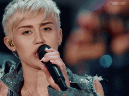 Miley Cyrus performing live, singing into a microphone with intensity, wearing a sparkling denim jacket.