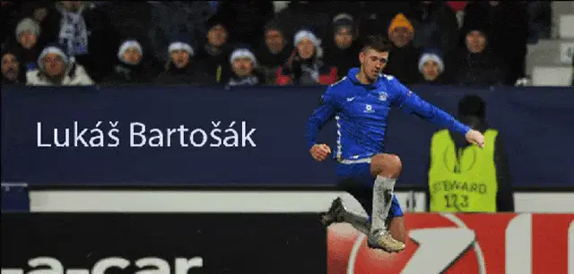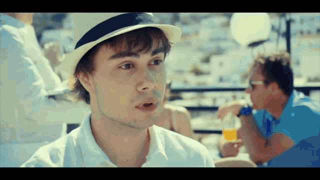 A young Czech man in a hat talks and gestures on a sunny outdoor terrace with other people.