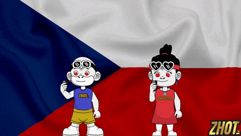 Two animated characters, a boy and a girl, dance cheerfully in front of a waving Czech flag.
