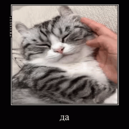 A happy tabby and white cat with closed eyes is being gently petted by a hand, enjoying the moment.