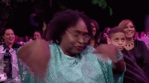 A joyful mom in a blue dress performs an epic dab at a lively event, bringing smiles to the crowd.