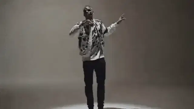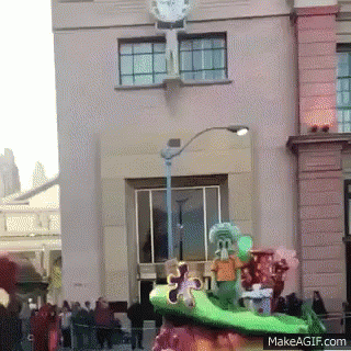 Squidward Tentacles mascot on a parade float performing a dab.