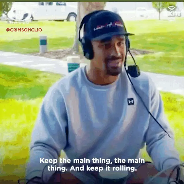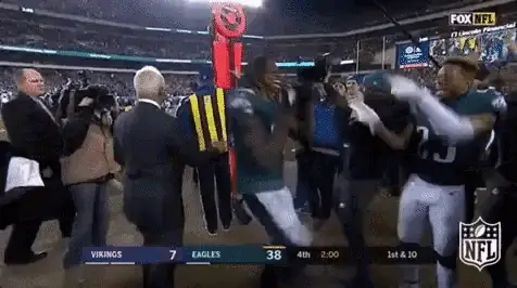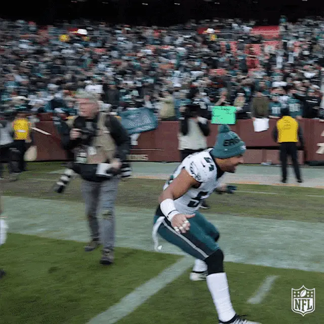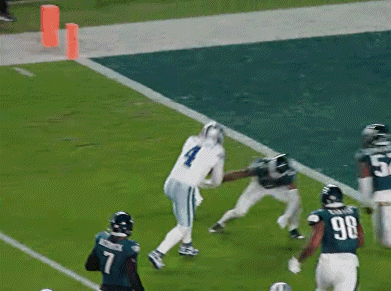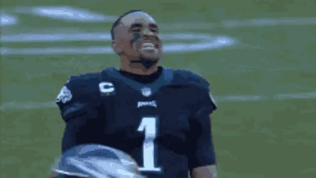 Philadelphia Eagles players make a tackle, followed by AJ Brown and Devonta Smith laughing on the sideline.