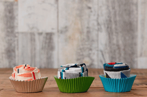 Three creative sock cupcakes, two featuring 'D' and 'A' flags, are displayed on a wooden surface for Father's Day.