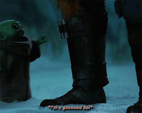 The Mandalorian stands with Baby Yoda (Grogu) who declares 'I'm a goooood boi' in a snowy landscape.