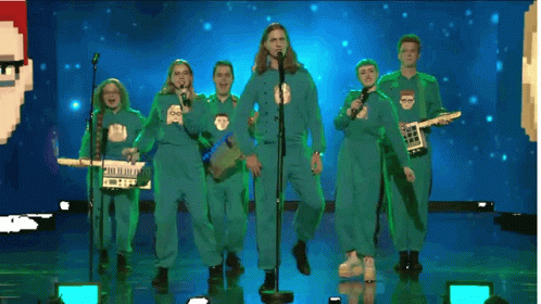Daði Og Gagnamagnið perform their hit song 'Think About Things' live on stage, dressed in their signature green jumpsuits.