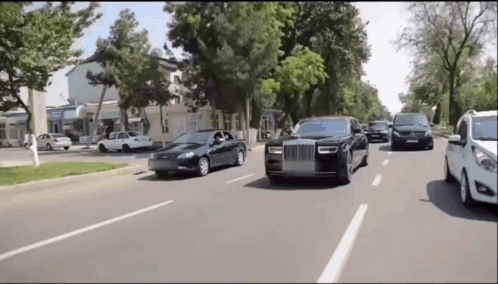 A black Daewoo Gentra (Jentra) drives on a tree-lined road in Uzbekistan, passing other cars including a Rolls-Royce.