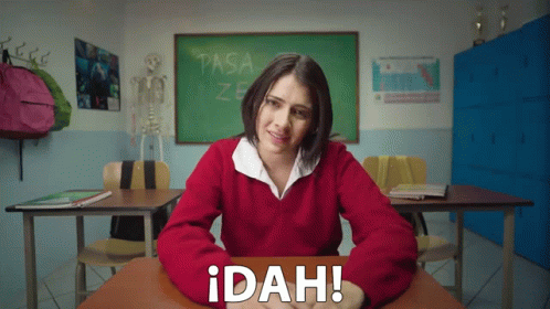 A girl in a red sweater exclaims '¡DAH!' while sitting at a desk in a classroom.