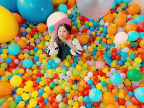 Dahyun of TWICE smiles brightly while surrounded by colorful balls and balloons in a vibrant ball pit.