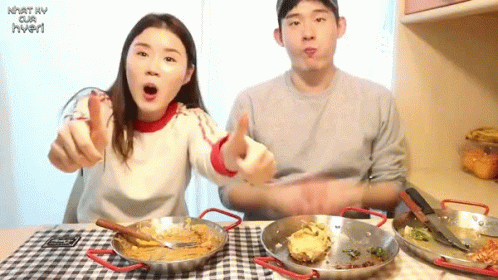 Cheri Hyeri and a friend celebrate a 'Great Success' with thumbs up after finishing a meal.