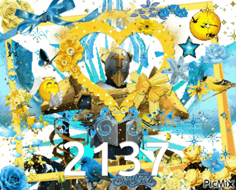 A vibrant collage featuring Gabriel from Ultrakill, surrounded by blue and yellow elements, with the number 2137.