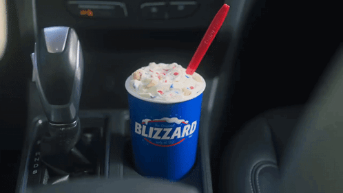 A delicious Dairy Queen Cake Batter Cookie Dough Blizzard with a red spoon, sitting in a car's cup holder.