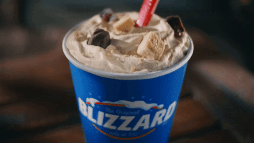 A close-up of the delicious Dairy Queen Caramel Fudge Cheesecake Blizzard with a red straw.