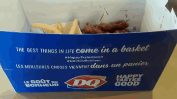 A close-up view of a Dairy Queen Honey BBQ Chicken Strip Basket, featuring crispy fries, saucy chicken strips, and dipping sauce.