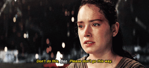 Daisy Ridley as Rey, distressed and pleading with Ben Solo, 'Don't do this, Ben. Please don't go this way.'