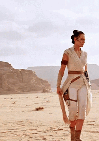 Daisy Ridley as Rey, the Jakku Scavenger, walking through a vast desert landscape in her iconic white attire.