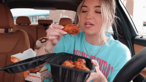 a woman eating chicken wings in a car wearing a t-shirt that says ' apollo '