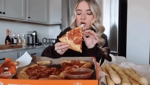 Daisy Sue enjoys a large slice of pepperoni pizza from Little Caesars, along with stuffed crazy bread.