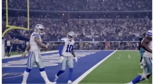 Dak Prescott and CeeDee Lamb celebrate a victory, walking off the field after a Dallas Cowboys win.