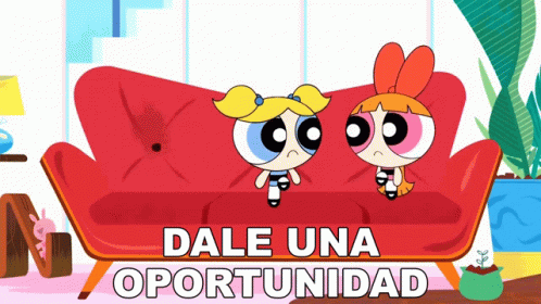 Bubbles and Blossom from The Powerpuff Girls on a red couch, with the phrase 'Give Her A Chance'.
