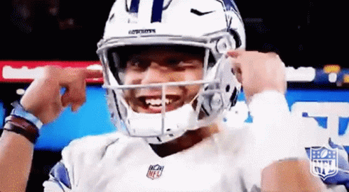A Dallas Cowboys NFL player celebrates on the field, wearing his helmet and smiling.