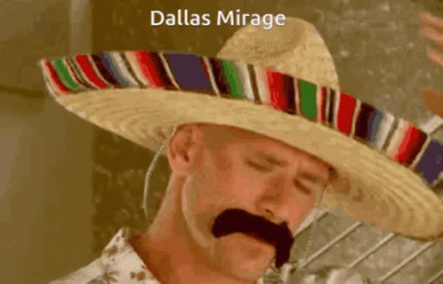 A bald man with a mustache puts on a sombrero, with 'Dallas Mirage' text overlaid.
