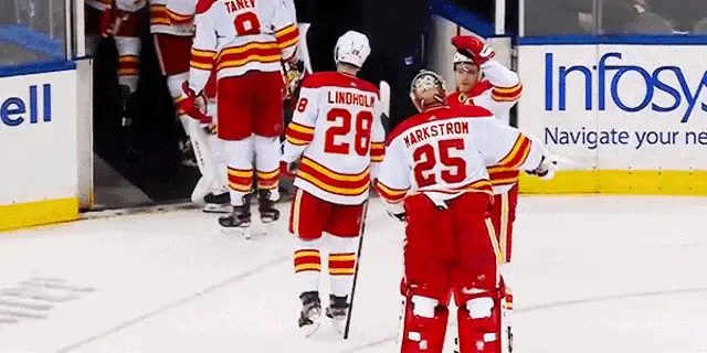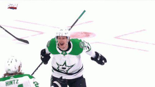 Dallas Stars hockey players, including Hintz, celebrate a goal with enthusiastic hugs on the ice.