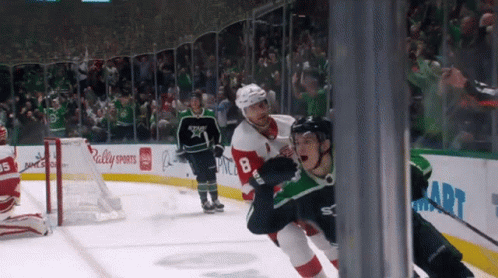 Dallas Stars player Nils Lundkvist on the ice during an intense overtime hockey game.