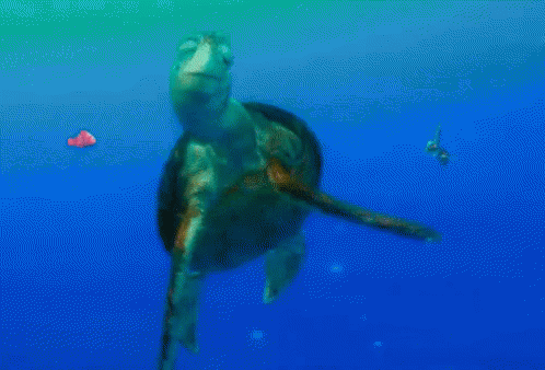 A sea turtle from Disney Pixar's Finding Nemo swims, with the iconic phrase 'Dame esa aleta'.