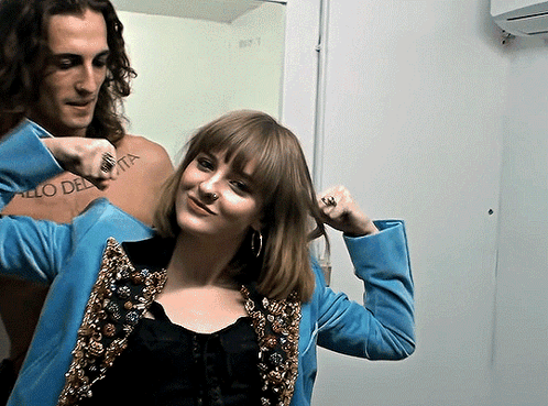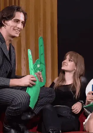 Victoria De Angelis poses playfully while Damiano David stands behind her, showing his 'IL BALLO DELLA VITA' tattoo.