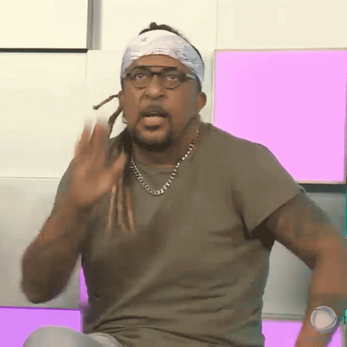Man with dreadlocks and bandana performs a funny hand dance on Power Couple Brasil.