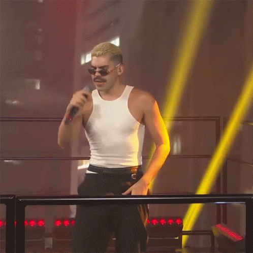 Mateus Carrilho energetically dancing and singing on stage, wearing a white tank top and sunglasses.